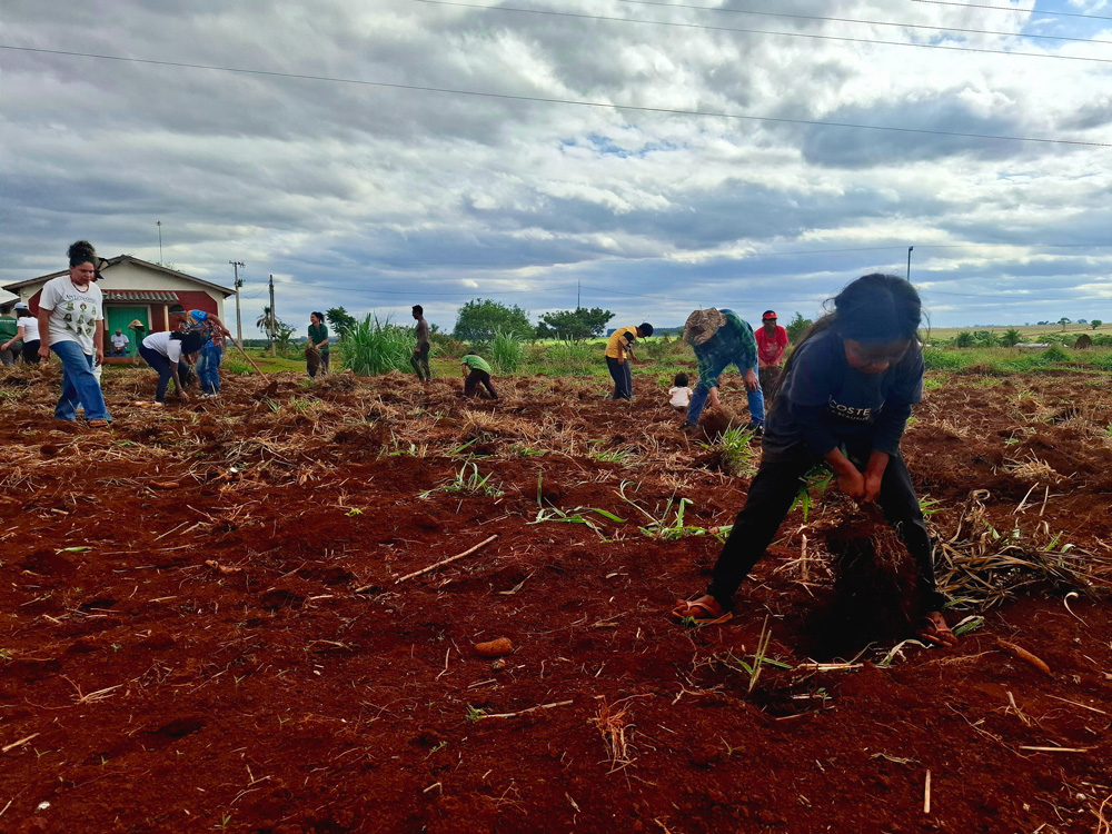 Em mutirão, braquiárias são arrancadas na mão, já que dias antes a Polícia Militar enterrou ferramentas de trabalho dos indígenas com uma pá escavadeira. Foto: Gabriela Moncau.