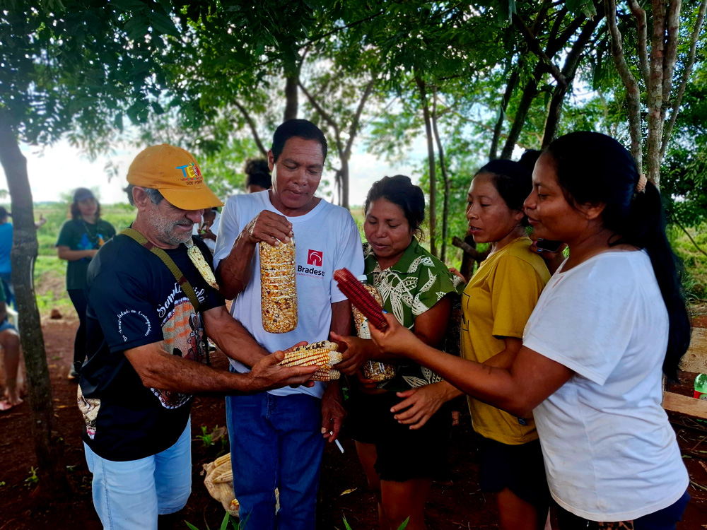 “Já é um conhecimento antigo da minha família. Meus avós cultivavam milho cateto, que é milenar. Eles chamam aqui de milho branco, é sagrado para os Guarani. A maioria dos milhos que os povos originários cultivam é o milho mole, como a gente chama. E a gente trouxe alguns outros, o milho duro, o que o povo na Bahia usa para fazer mungunzá”, explica Valmir.