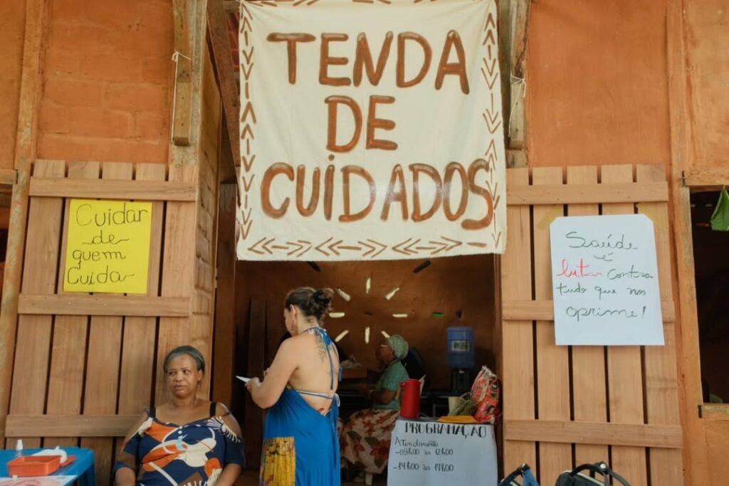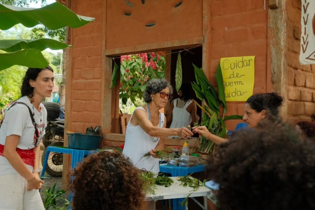 Organizada pela Rede de Saúde da Teia dos Povos, a Tenda de Cuidados em Saúde foi outro espaço que funcionou durante todo o Encontro. Lá, companheiras puderam acessar diversas técnicas terapêuticas, formações, momentos de escuta coletiva e partilhas de medicinas tradicionais, como uso de ervas e produção de fitoterápicos.